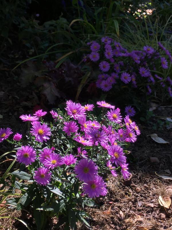 Die etwas niedrigere standfeste Kalimeris incisa 'Madiva' eignet sich auch gut als Vorpflanzung. Sie blüht ja schon ab Juli und zeigt dann später im Herbst eine schöne Blattfärbung.