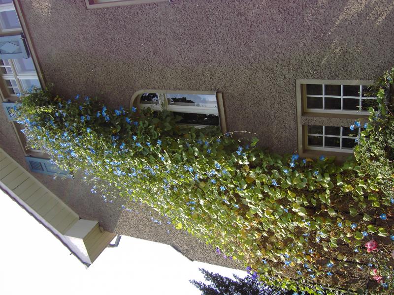 Als ich es vor ein paar Jahren sah, war die Hälfte der Hausfront auf der Südseite mit einer riesigen blauen Winde bedeckt, sehr beeindruckend, sie reichte bis zu den oberen Fenstern. Mich störte das Grau des Putzes nicht, so ist das Haus doch schon lange bekannt.