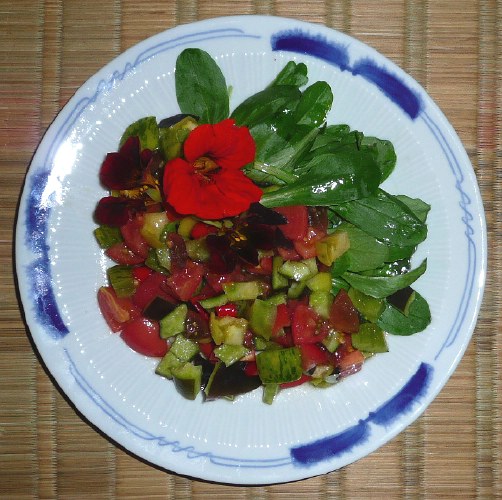 Fotos von vorgestern: Luna, hilf, bitte! Was kann man anders machen, damit die Fotos hübscher werden?Salat mit den (bei diesem Sauwetter) wahrscheinlich letzten Kapuzinerblüten.