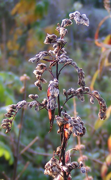 BB:Bei den "Schneeflocken" handelt es sich um den Samenstrand der wilden Waldrebe (Clematis vitalba).Dein Fruchtstand der Kapuzinerkresse (?!) ist einfach toll.GrußFrank