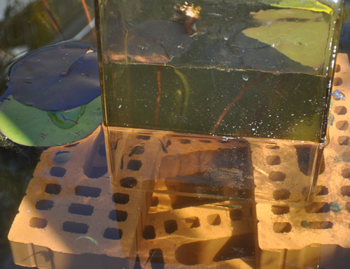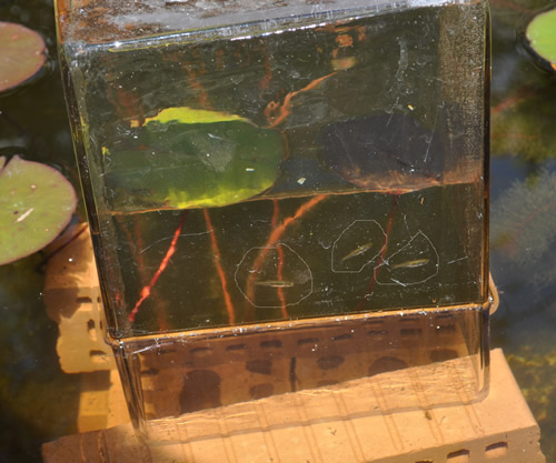 Sie schwammen ruhig dahin, einige dösten auch andere guckten von drinnen neugierig übers Wasser. Es waren bis zu 20 Jungfischen drin, soviele wie noch nie. Ein richtiges Gedränge, so dass auch einige Schwanzschläge ausgeteilt wurden!Den Kies legte ich oben drauf, damit keine Krähe darauf landet, da er leicht wegrutscht.Ein herrliches Bild (und eine Abwechslung für die Fische)