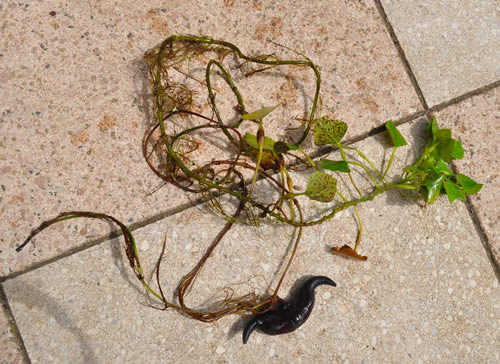Vor kurzem habe ich diese Schwimmpflanze gefunden. Eine Wassernuss.Der Trieb ist ungefähr 1,2 m lang.Leider sinkt der "Anker", die Nuss nicht zum Boden ab, sondern schwebt in ca. 50 cm Tiefe.