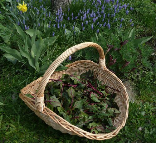Ich habe heute nur Kräuter geerntet: Scharbockskraut, Brennesseltriebe, Bärlauch, Knoblauchgrün, Winterheckzwiebel. Sauerampfer, etwas Salbei und Gundermann und noch eine schöne Portion Feldsalat.