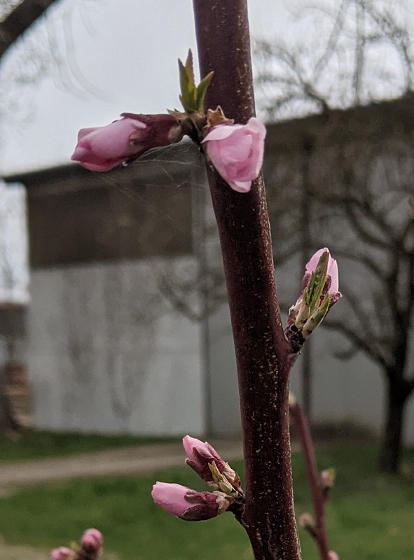 Meine einjährige Robijn Veredelung macht gerade die Blüten auf. Minimal vor den Pfirsichen, das Bild ist noch vom Wochenende.