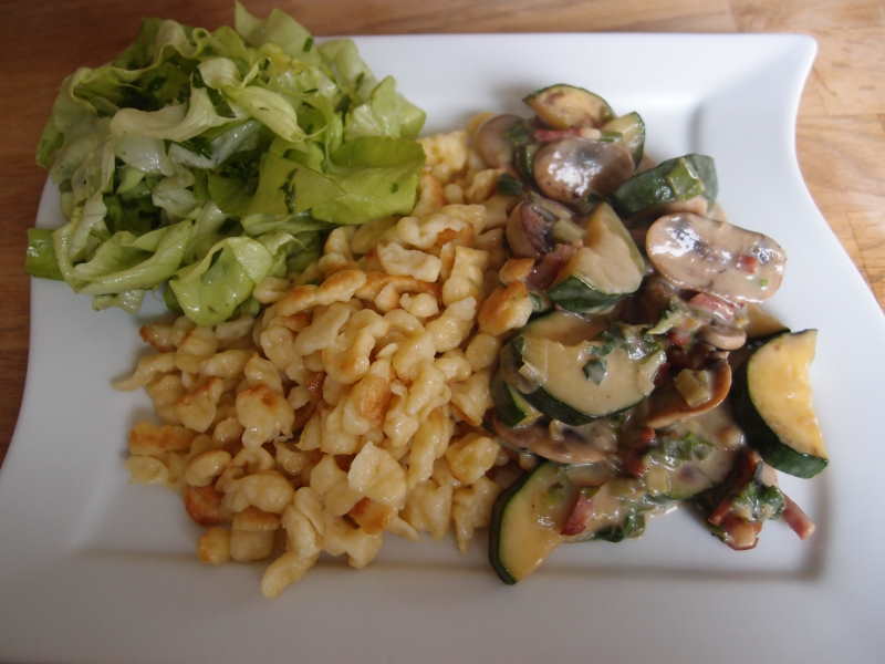 bei uns gabs vorgestern die restlichen knöpfle, angebraten, dazu eine soße aus speck, zucchini, champignons und frühlingszwiebeln. dazu salat.