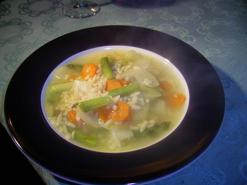 Ja, Quendula, ich liebe auch diese einfachen italienischen Brot- und Gemüsesuppen, einfach lecker.Bei uns gab es am Sonntag weißen und grünen Spargel mit Butter und Parmesan und Schinken.Und am Montag gab es dann die erste Gemüsesuppe der neuen Saison mit Möhren, Kohlrabi, grünem Spargel und ein paar Risoni.Hier gab es Mille fanti (italienische Brotsuppe) mit Möhrchen und Spargel.