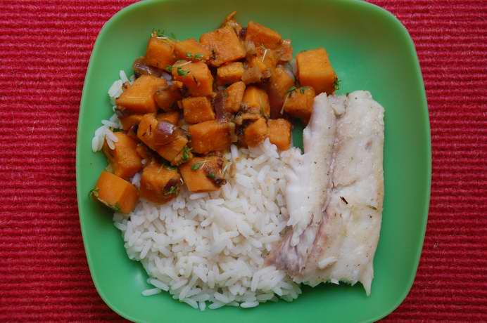 Hier gab es Victoriaseebarsch mit Reis und Süßkartoffelcurry (Süßkartoffel, Zwiebel, Ingwer, getrocknete Cranberrys/Blaubeeren (Rosinen waren aus), Kresse).