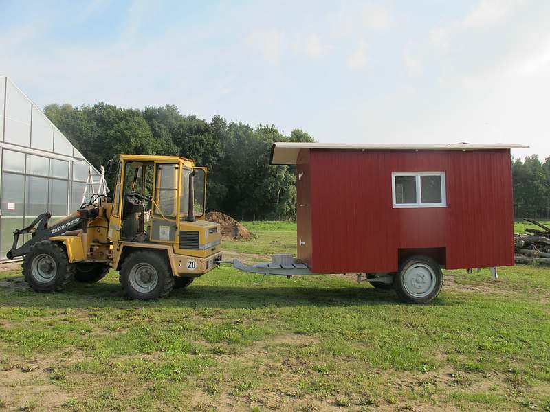 Ein Einachser kommt logischerweise hinten runter, wenn man ihn vorn anhebt. Ich habe einen Wagenheber unter die an den Radlader gehängte Deichsel gestellt und diese so weit hochgehoben, wie es ging. Dann hat der Radlader den Bauwagen sachte hinausgeschoben bis der Wagenheber umfiel. Es hat funktioniert. Nur die Dachpappe hat es abgerissen. Als nächstes ging es mit dem Bauwagen auf den Hof des Dachdeckers. Er wird professionelle Schweißbahn auf den Bauwagen kleben. Sein Kommentar: „Es ist das erste Mal, dass eine Baustelle zu mir kommt.“