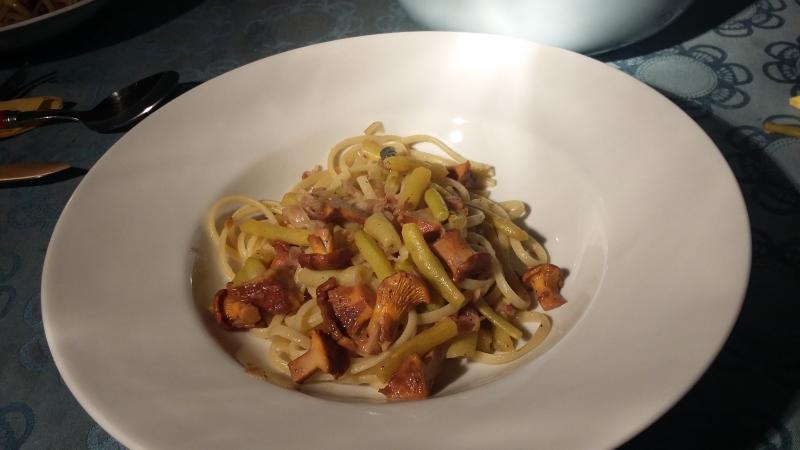 Wir hatten letzten Freitag Linguine mit Pfifferlingen und gelben Bohnen.
