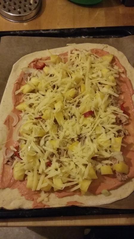 Donnerstag: Pizza mit Tomatenmark, Thunfisch, Ananas, Zwiebel, Chili und Emmentaler.