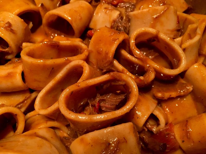 pasta mit tk-resten (ochsenbäckchen in rotwein) mit frischem knoblauch und getrockneter tomate (gebraten und geschmort) aufgehübscht.
