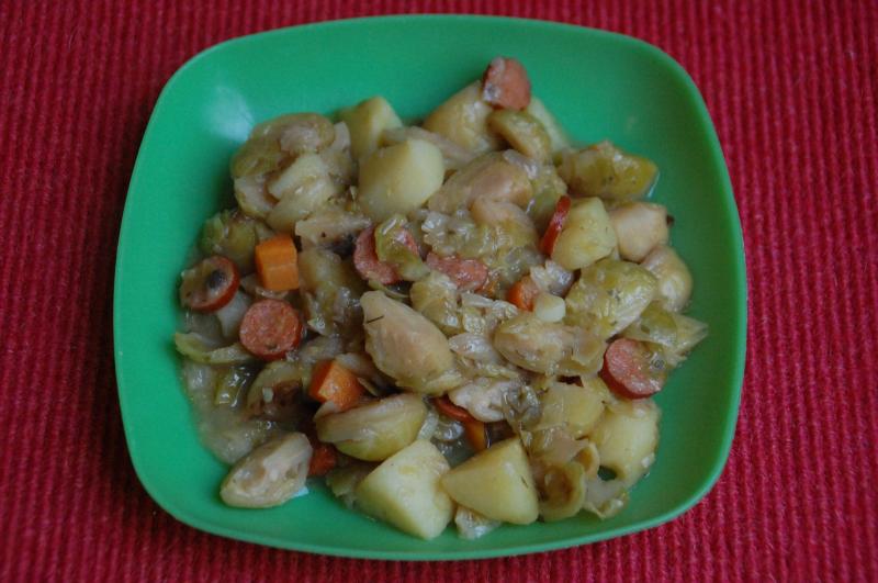Rosenkohleintopf (Butter, Zwiebel, Rosenkohl, Kartoffeln, Möhre, Gemüsebrühe, Piment, Pfeffer, Salzpetersilie, getrocknete Gartenpilze, Käse-Cabanossi, ein Rest Meerrettich-Dill-Soße von den gestrigen gebratenen Makrelen)