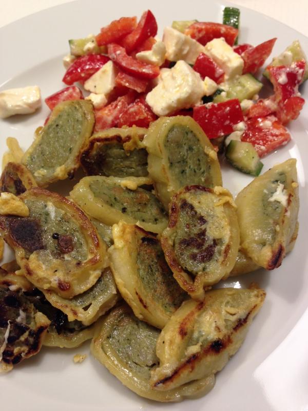 Ich hatte gestern eine Brokkoli-Pfanne (mit Drilling, etwas Frühstücksspeck und Kräuter-Frischkäse), dazu Tomatensalat.