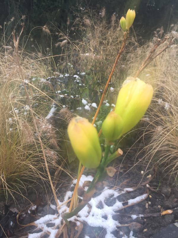 Die paar Schneeregenschauer überzeugen meine Pflanzen nicht, jetzt mal die Winterruhe einzuhalten (Die winterblühende Kamelie nehme ich aus...)