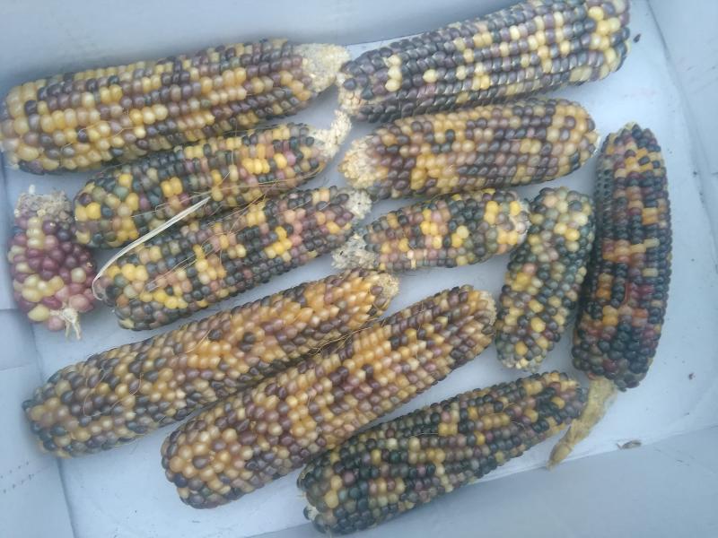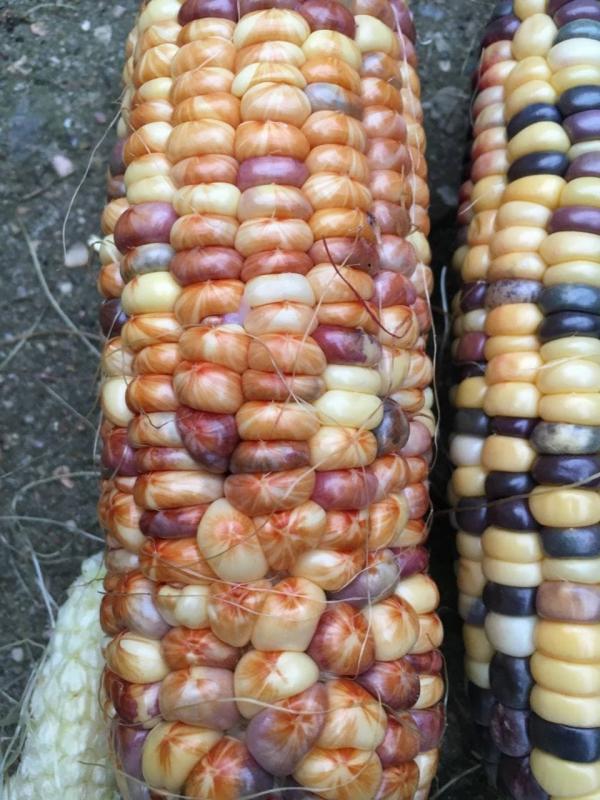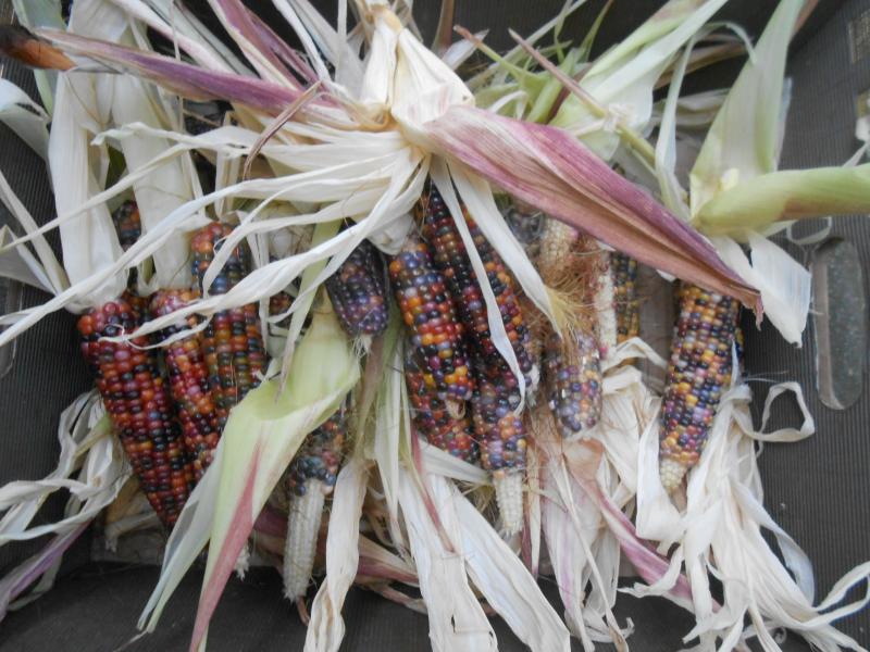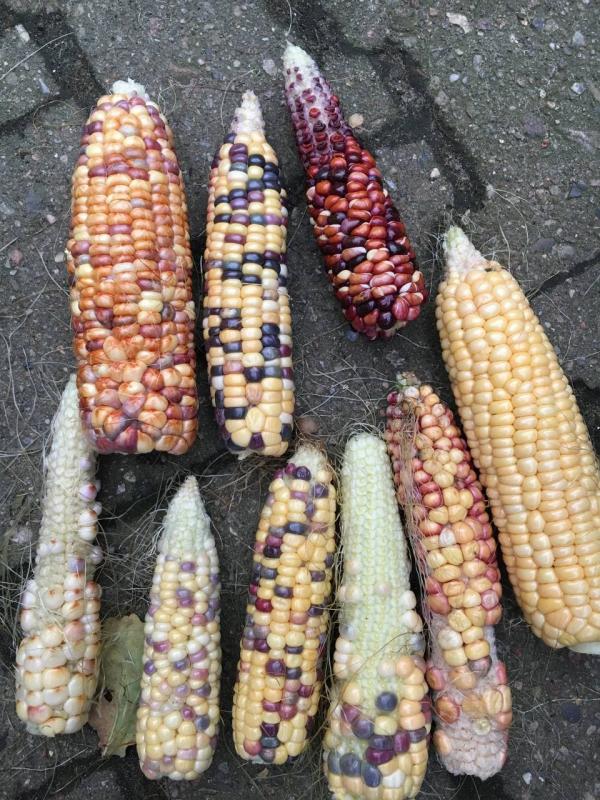 Die Maisernte ist noch nicht ganz beendet, aber es gibt schon einige vorzeigbare Exemplare. Es ist inzwischen die F3 Generation zwischen Bear Paw und Glass Gem. Die untere Reihe scheint noch weitgehend reiner Glass Gem zu sein. Die Kolben sind noch recht feucht und wahrscheinlich auch nicht richtig ausgereift. Das Frühjahr war lange zu kalt und der Frost kam früh. :(