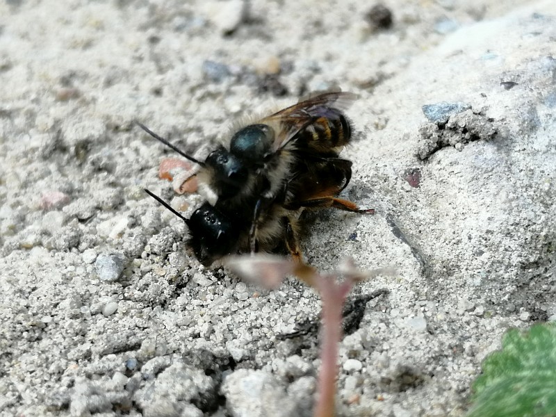 Ich glaube, Osmia bicolor hab ich gestern hier auch gesehen, die orange-dunklen Streifen waren auffällig.