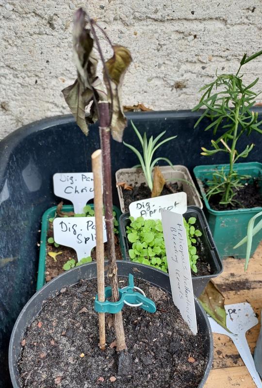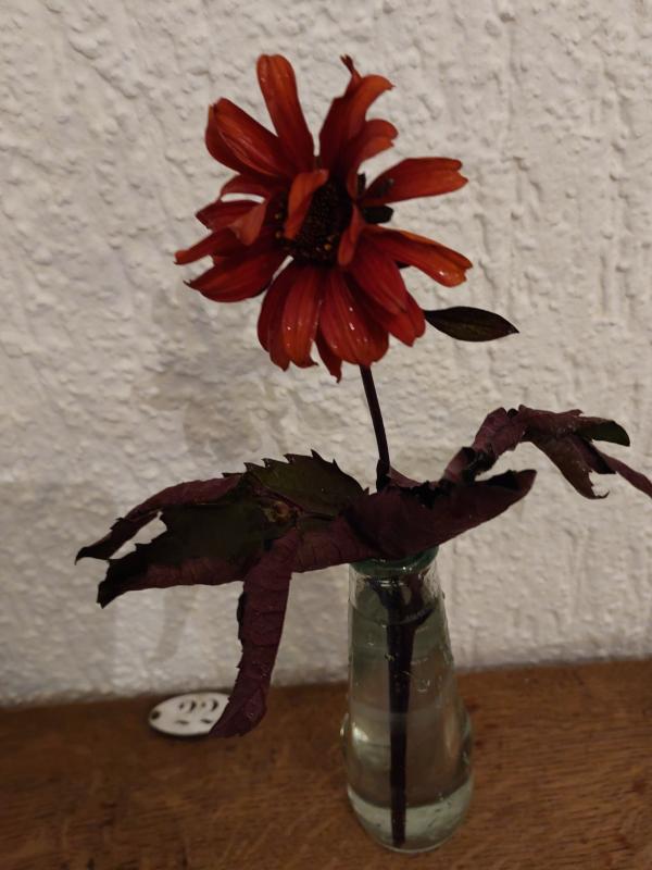Inzwischen hatte ich Emailkontakt mit Marcel de Wagt. Sehr schnelle Antwort. Er vermutet, die Pflanze sei beim Transport abgebrochen. Ich denke nicht, denn sie war gestäbt. Ich habe sie nochmal eingekürzt. Das Innere des Stängels ist grün. Sie steht jetzt im Topf im Gemüsehochbeet mit Deckel. Trocken und schattig. Das Teil in der Vase hat sich erholt. Knackiges Laub!!