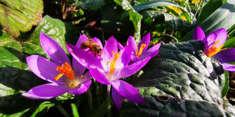 Ich habe das alte Laub zwischen den Frühblühern zusammengerafft. Wahrscheinlich habe ich eine Biene dabei mit gegriffen.