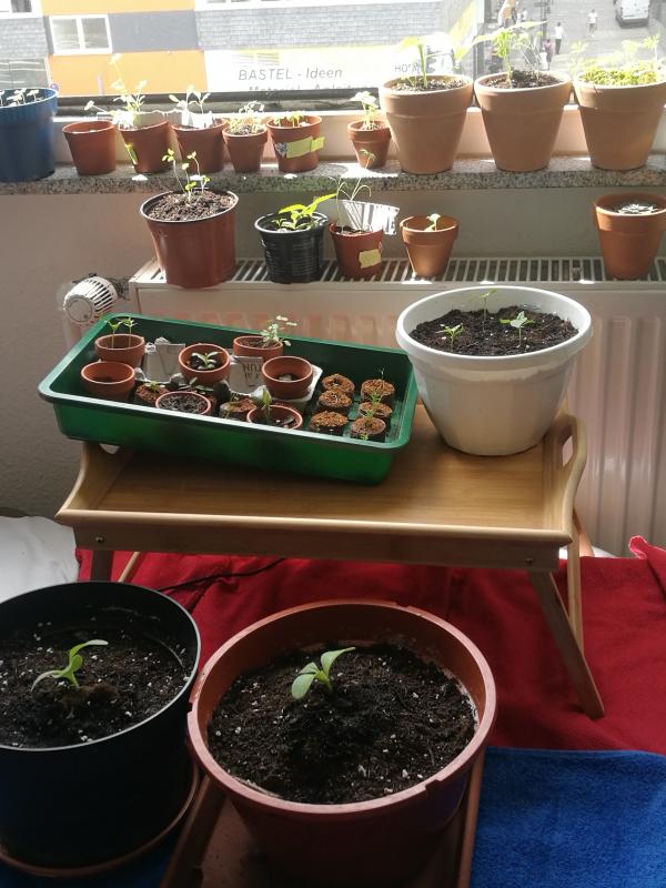 Blumen: Zwergsonnenblume, Lavendel, Steinkraut, Wicke, Iberis( zieht bald ins Freie zu den Familiengärten bis wir umziehen).