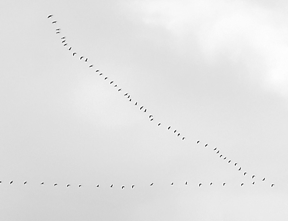So ein ähnliches Foto vom ersten gesichteten und gehörten Kranichzug in diesem Jahr habe ich gestern auch gemacht, aber gleich wieder gelöscht, die Kraniche hoch oben nicht in Formation, sondern im Aufstieg in einer warmen Luftströmung.