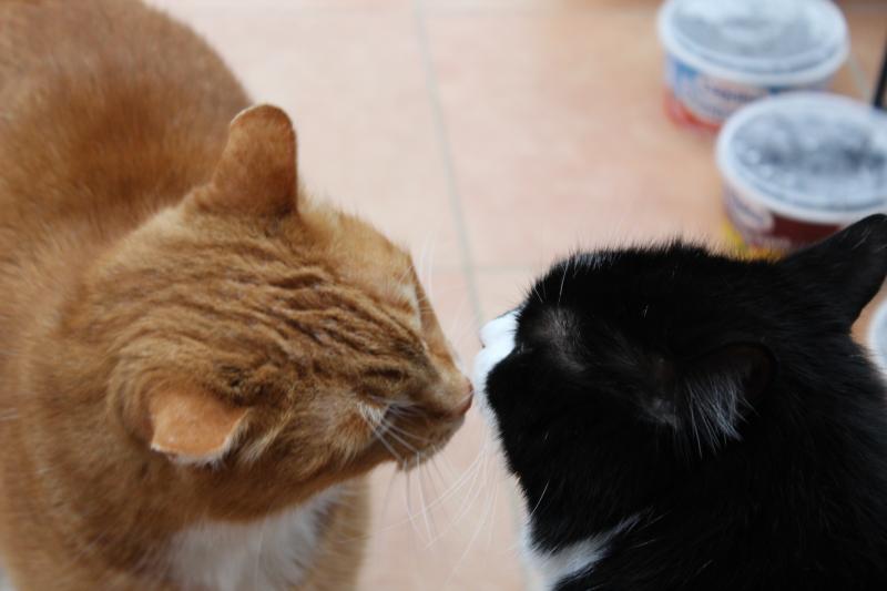 Gestern war ich im Wintergarten sehr intensiv damit beschäftigt, meine Baumpäonienbabys zu registrieren und zu fotografieren. Plötzlich ein Fauchen in unmittelbarer Nähe - da bin ich mit der Kamera kurz rübergeschwenkt und hatte zwei Katzenköpfe vor der Nase. ;D