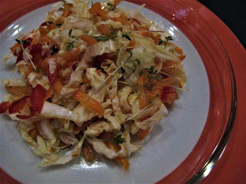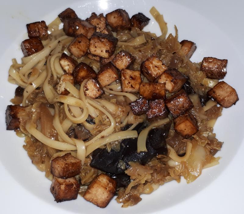 Udon-Nudeln mit Wirsing, Mu err und gebratenem Tofu, Endiviensalat