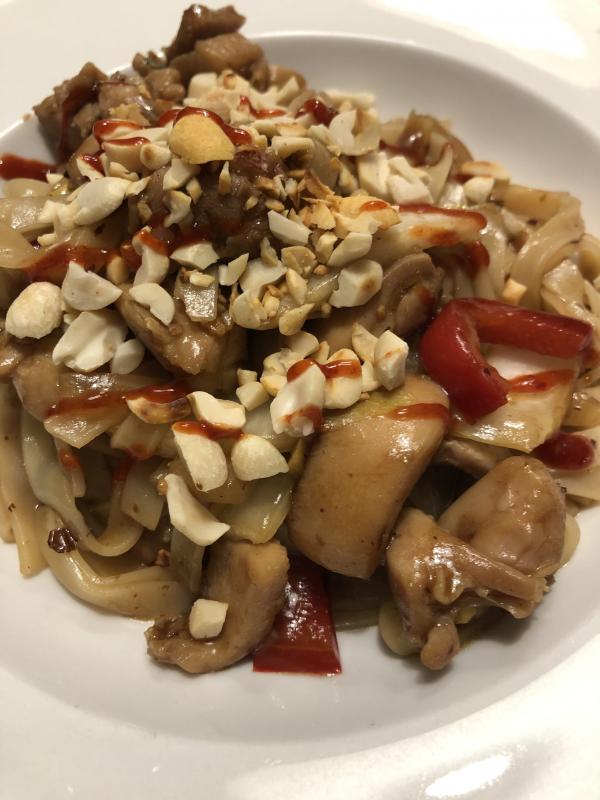 Hier gabs heute breite Reisnudeln mit Hähnchen, Paprika und Chinakohl. Oben drüber Erdnüsse.