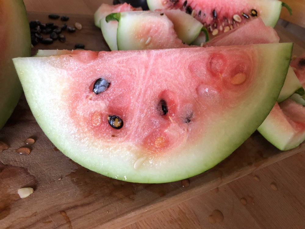 Ich bin von der Sorte Primaorange ziemlich angetan. Wahrscheinlich etwas zu früh geerntet, aber trotzdem toller Wassermelonengeschmack, saftig, süß, zart - zergeht regelrecht auf der Zunge. Die beste Wassermelone, die ich je gegessen habe! Nur der Ertrag war leider dürftig: eine 3kg-Frucht an der Pflanze. Hoffentlich geht da nächstes Jahr bei einem besseren Juni mehr. Zudem werde ich die Pflanzen auch früher entspitzen.