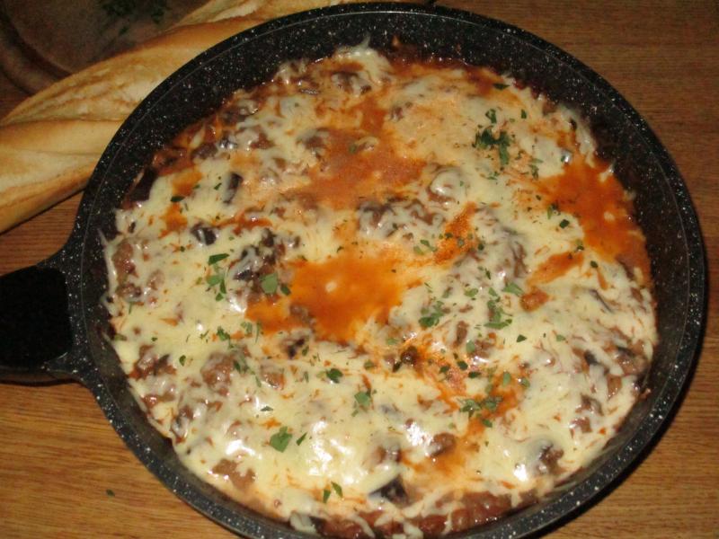 Hier gab es Pfannenmoussaka nach Studentenart (Aubergine, Rinderhack, Zwiebel, Knoblauch, Tomatenmark, Gemüsebrühe, Oregano, Creme fraiche, Zimt, Muskat, Pfeffer, ger Emmentaler).