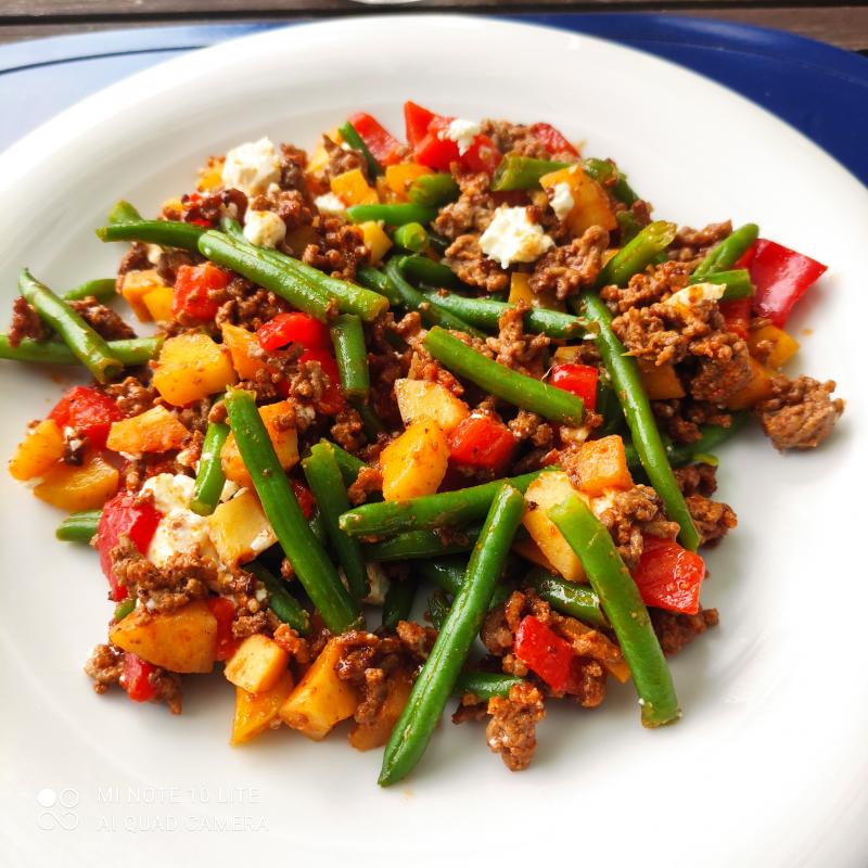 Hack-Paprika-Pastinaken-Möhren-Pfanne mit Bohnen und Feta.