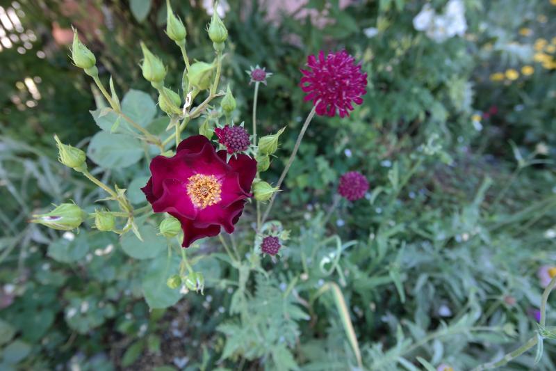 (Die passenden roten Knöpfchenblüten sehen nach Knautia macedonica/Purpurwitwenblume aus. ;) )