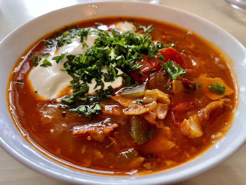 … heute eine freestyle-soljanka, in der keine tomatenpaprika, aber massenhaft ungeliebtes ketchup verarbeitete wurde. außerdem saure gurken, frische champignons und tomaten sowie – neben einer zu diesem zweck eingefrorenen wurst- und schinkenauswahl – eine plötzlich im tk aufgetauchte, vorab entbeinte barbarie-entenkeule. 8) ;D