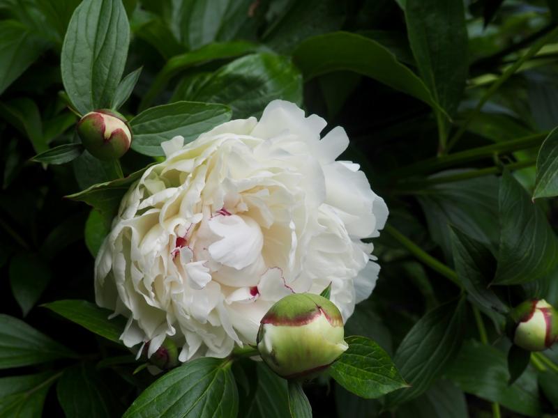 eine Päonie, weiße, üppige, gefüllte Blüten. Die sind so schwer, dass sie ohne Staudenstütze mit den Köpfen im kleinen Teich landen würden. Leider kenne ich keinen Namen... Sie wurde vermutlich schon lange vor meinem Einzug gepflanzt. So geht es mir mit allen der Päonien in unserem Garten. Die Vorbesitzer liebten offensichtlich Pfingstrosen.