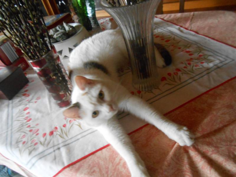 So was ist Blanka auch. Sie hat manchen Blödsinn im Kopf, aber auch schon viele Mäuse gefangen. Hier krallt sie sich an einem auserkorenen Schlafplatz fest, der mir aber nicht gefällt. Bei fremden Menschen nimmt sie auch Reißaus. Ganz im Gegenteil zu ihrer Vorgängerin Fanny, die in der ganzen Nachbarschaft herum stromerte oder sich auf der Straße bei Spaziergängern einschmeichelte und streicheln ließ. Mir läuft Blanka überall hinterher.