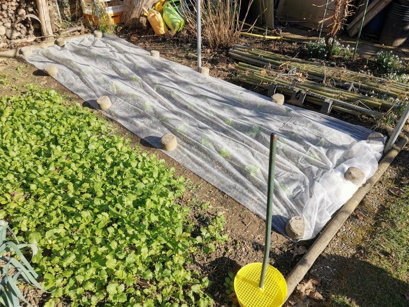 Da es noch früh im Jahr ist, mit Vlies abgedeckt.