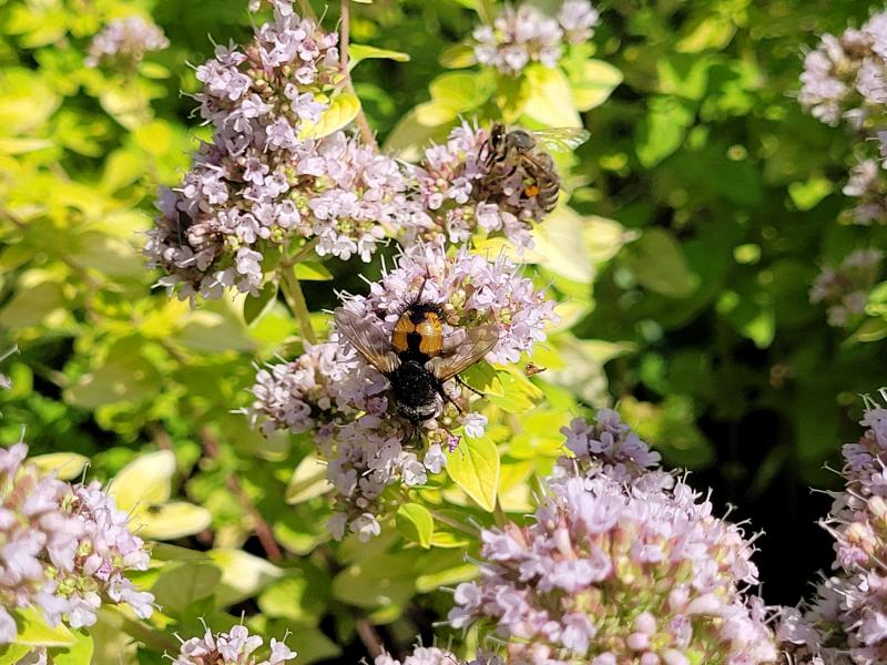 Origanum vulgare 'Thumbles Variety' blüht schon etwas länger. Immer mit Besuch von ganz verschiedenen Insekten, geschätzt mindestens 100 an einer Pflanze. Dabei viele verschiedene Wildbienen...der ganze Busch ist in brummender Bewegung. :o