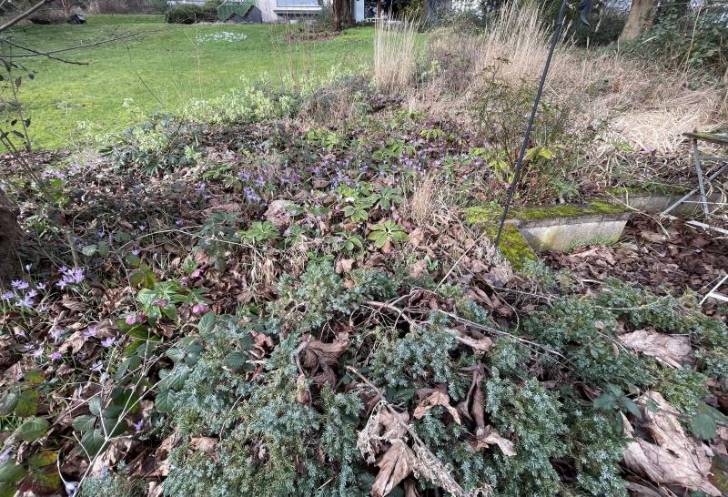 Inzwischen, seit die Winter so kurz geworden sind hab ich den Räumschnitt weitgehend auf den Herbst verlegt. Wenn im Januar schon überall die Geophyten durchtreiben ist es zu spät fürs Abräumen. Jetzt vor allem Rosen- (eigentlich noch zu früh) und Gräserschnitt, die wegen Winteraspekt stehengelassen wurden. Und natürlich Laub. Winterschutz bleibt noch drauf.