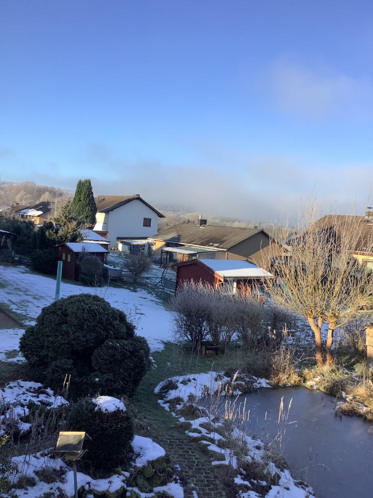 Wir hatten den ganzen Tag blauen Himmel und Sonnenschein über der verschneiten Landschaft, herrlich nach dem vielen Nebelgrau in letzter Zeit. Jetzt ist der Himmel sternenklar, aktuell -3°C.