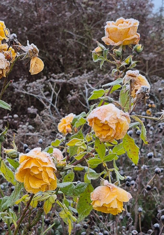 Die letzte Rose, sollte eigentlich Ilse Krohn sein, dafür aber etwas rosa, die letzten Clematis und die Passiflora ist jetzt im Haus, nur die Blüte hängt noch…