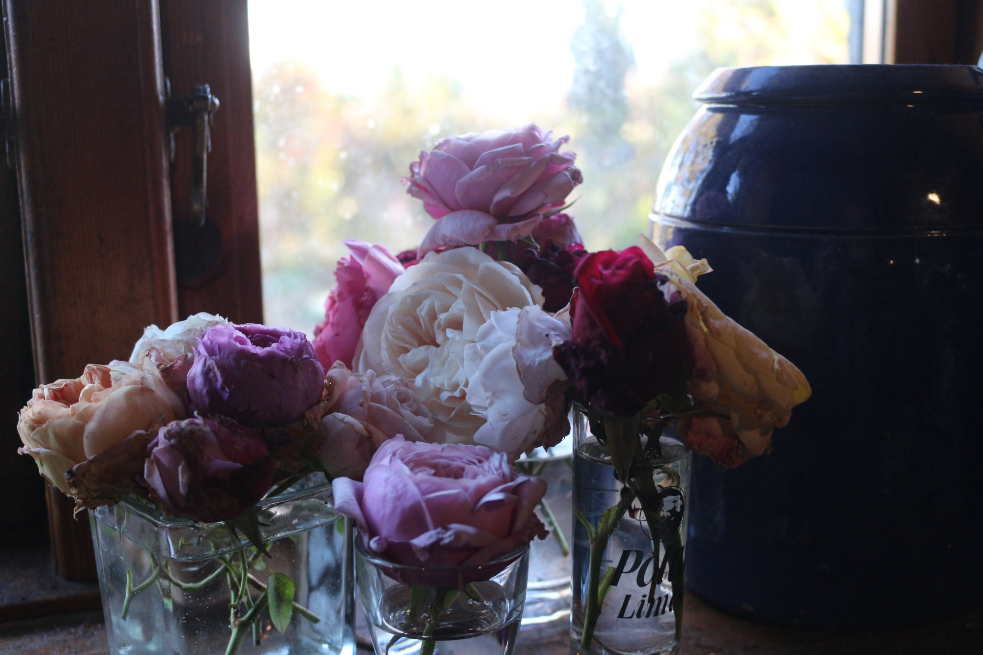 GG hat heute die letzten, duftenden Rosenblüten fotografiert, die ich gestern abend noch schnell in´s Haus geholt hatte: Die letzte Blüte von Die Welt (ganz rechts) hat nicht mehr lange durchgehalten. Die anderen (überwiegend Tee Hybriden und Austin-Rosen) beduften noch die Küche