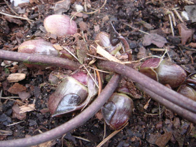 und ausgerechnet DAS habe ich mir auf der Raritätenbörse gekauftAsarum caudatum hat bei mir das Zeug zum (lieblichen) Unkraut. Es samt sich stark aus, verdrängt die Cyclamen und taucht praktisch überall in der Rabatte auf - auch an vollsonnigen Stellen und auf Sand.