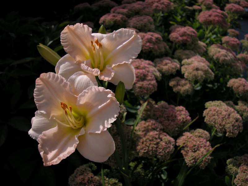 Dieses Foto habe ich gerade gemacht. 'Lullaby Baby' hat noch einen Blütenstiel nachgeschoben. Das Foto egalisiert die Farben der Taglilie und der Fetten Henne enorm. In Wirklichkeit passen die beiden Pflanzen farblich nicht so gut zusammen, weil sie völlig unterschiedliche Rosatöne haben.Liebe GrüßeElke