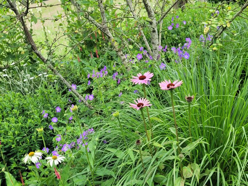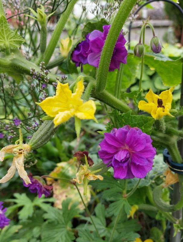 Rozanne rankt sich hier in diesem Jahr etwa 1,5 Meter hoch in die Rosen hinein... noch höher als üblich und teilweise auf Höhe der Rosenblüten. Muss wohl der Regen sein.