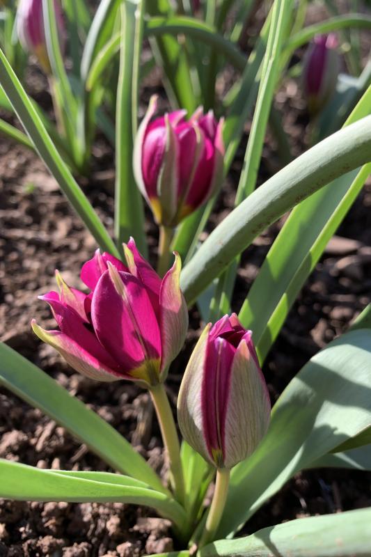 Heute haben sich hier die ersten Tulpen geöffnet, kann das ‚Persian Pearl‘ sein? Lässt sich leider nicht wirklich gut fotografieren, weil die Blütenstände kürzer sind als das Laub, und alles so kreuz und quer wächst…