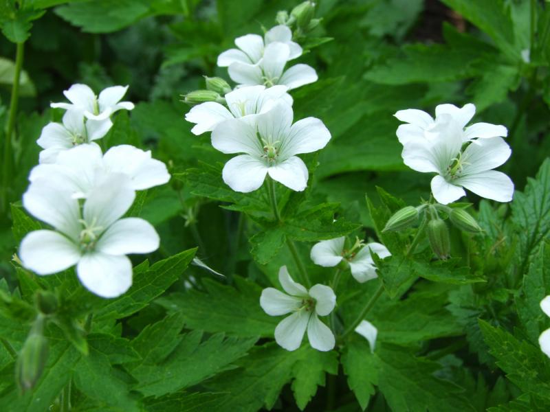 Gut,es blühen hier und da weiße Geranium sanguineum alba