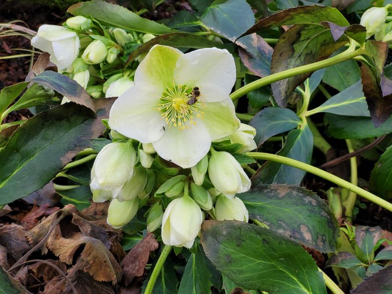 'Christmas Carol' blüht bei dem frühlingshaften Wetter täglich weiter auf, einige Bienen freuen sich.