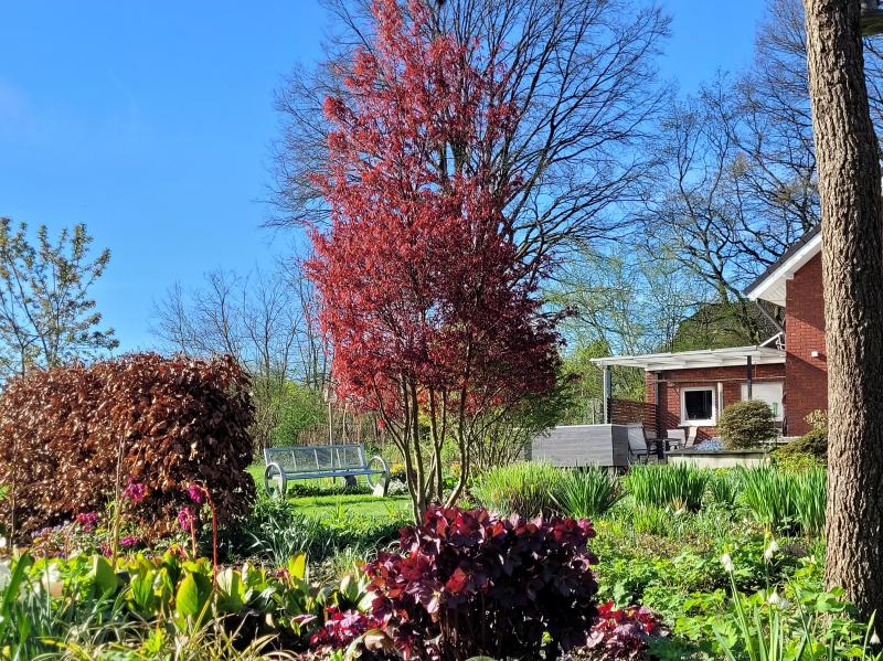 Weiter hintenrum am Kompostplatz vorbei. Hier erstrahlt nun Acer 'Skeeter's Broom' in leuchtendem Rot. Was ist der in die Höhe geschossen!!! Mittlerweile schon ein richtig großes Bäumchen. :o