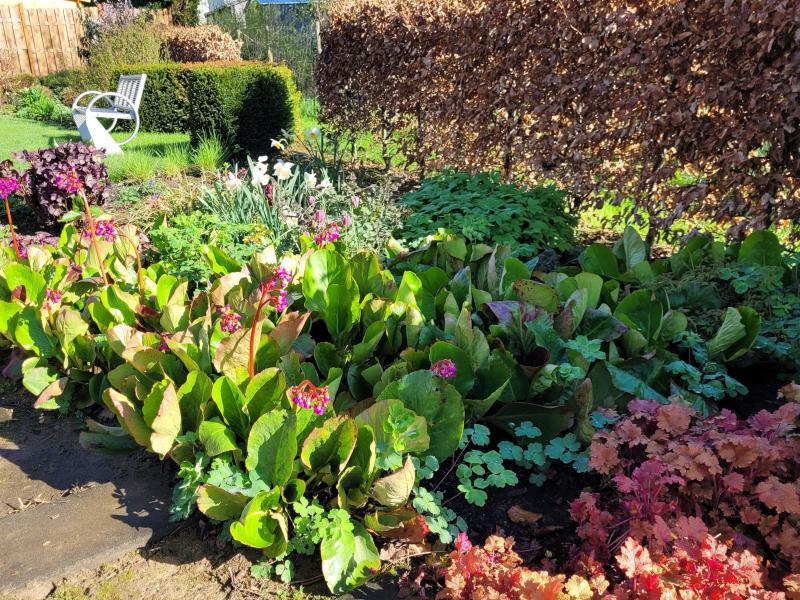 Wieso sollen die Bergenien da nicht hineingehören, nur weil's keine "Präriepflanzen" sind? Ich finde sie jedenfalls auch wunderbar, und gerade am Beetrand passen sie immer gut. Auch müssen die Sträucher noch nicht unbedingt grün austreiben, wenn sie so überschäumend blühen wie die Zierkirschen. :D Wie machst Du es, dass der Rasen nicht ins Beet wächst, stichst Du den regelmäßig ab, ist da noch eine unsichtbare Rasenkante, oder sind die Steine dicht genug gelegt, dass dort nichts einwächst? Oder wächst Dein Rasen schlicht und einfach verhaltener als meine Wucherwiese? ;)