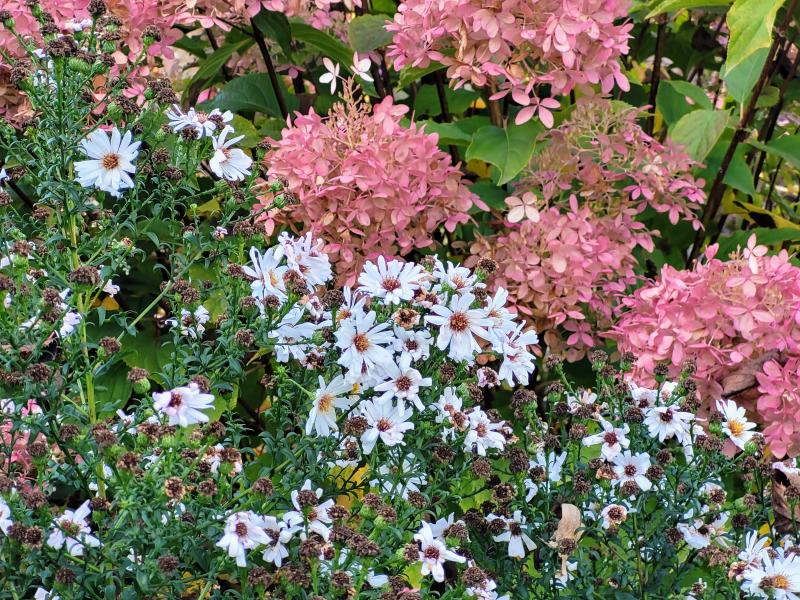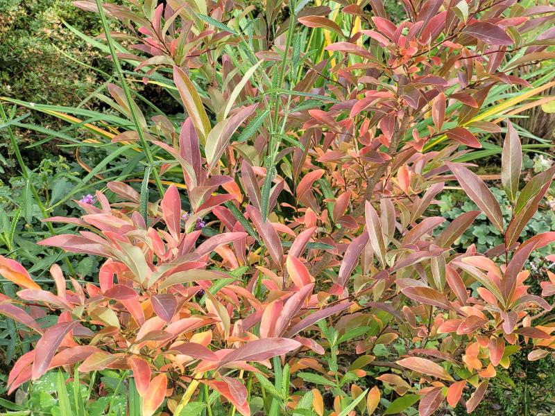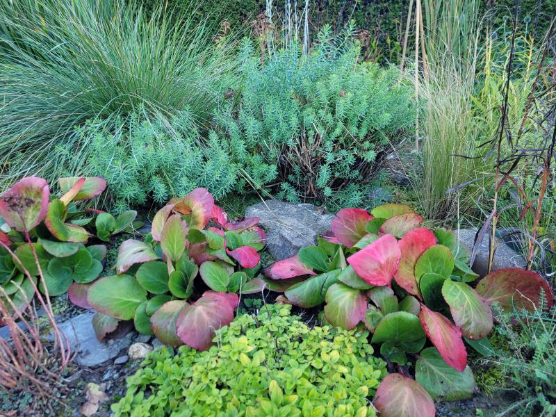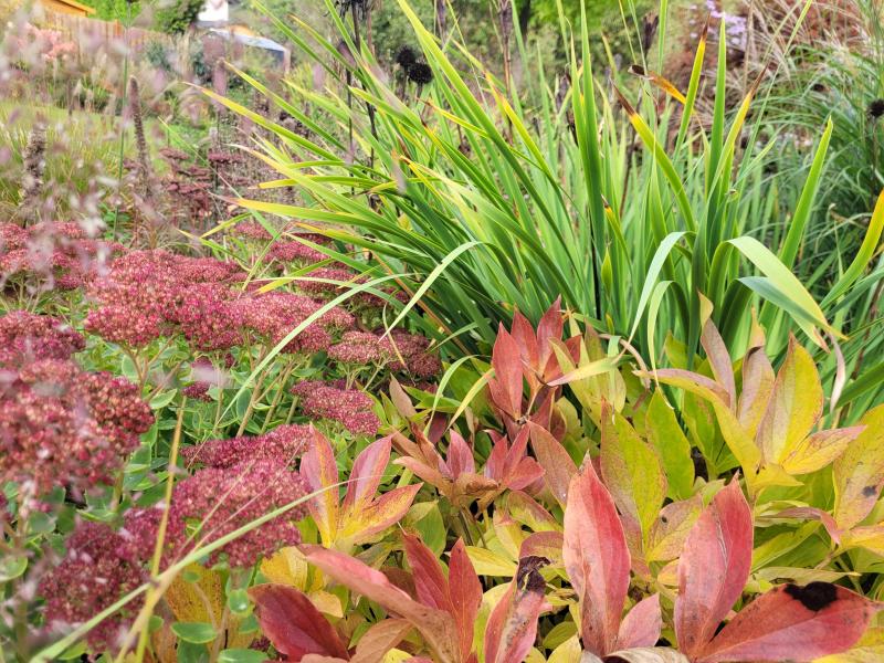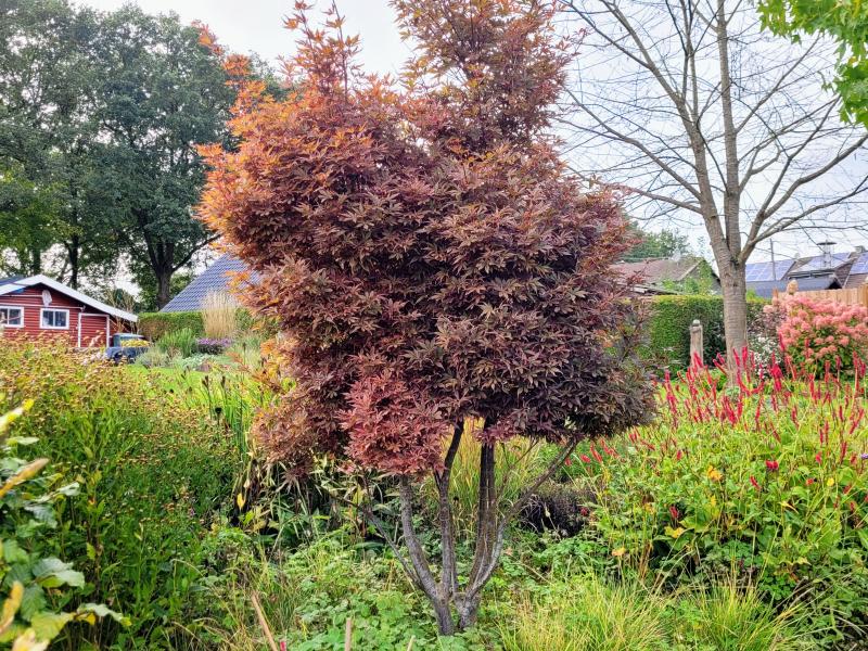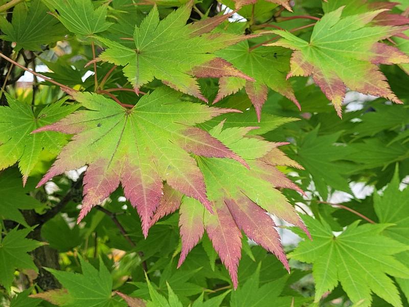 Beim Ahorn 'Skeeter's Broom' beginnt das eher düster dunkle Laub sich nun aufzuhellen.