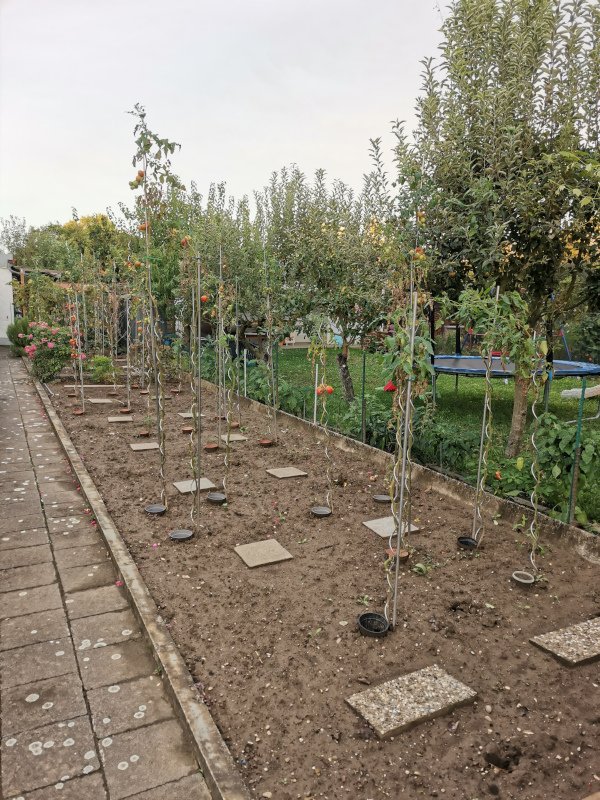 Da ist wirklich fast alles falsch. Aufgenommen Nein Illeffen. Geiztriebe ausdünnen ist top, zumindest im unteren Bereich, das muss man loben. Oben hätte ich sie gelassen, statt die Pflanzen zu kappen, Laub bringt gerade im Herbst Punkte. Der Boden, von was soll der leben? Vom tothacken? Wie war das Märchen mit den vergrabenen Blumentöpfen? Gegen Braunfäule helfen sie scheinbar nicht, sonst wären die Pflanzen nicht nackig. Bei der Gelegenheit sollte man auch mal über Plastikmüll im Garten nachdenken und die Tomatenspiralen sind scheinbar auch zu kurz. Bei diesem Anbausystem hat sich auch die Frage mit dem nachreifen lassen von selbst erledigt.
